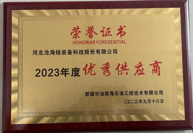 近日,河北滄海核裝備科技股份有限公司先后榮獲2023年度中國石油化工股份有限公司金陵分公司物資裝備中心、新疆華油新海石油工程技術(shù)有限公司頒發(fā)的“優(yōu) 秀供應(yīng)商”榮譽稱號,為公司榮譽墻再添新彩。